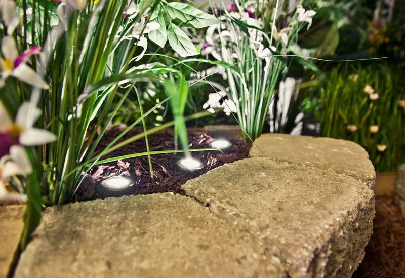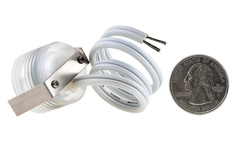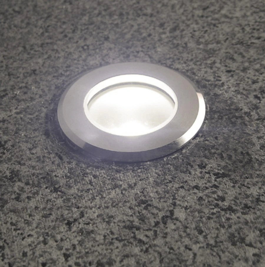 Mini round recessed LED lights are ideal for deck or step lighting, and you can use them in other outdoor lighting applications, such as pathway lighting. The 6 LEDs have an output of 25 lumens with a 90-degree beam angle for accent lighting and ambient lighting. This low-voltage step light has a 12V AC/DC operation for wiring directly into your existing landscape lighting system. A waterproof polycarbonate housing and shatterproof acrylic lens seal all internal components. Flush mounts in a 1.38″ hole using mounted retention clips. Available with a black, white, or brushed nickel finish plastic trim to match your designs. See similar single LED round plastic trim mini step lights.