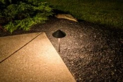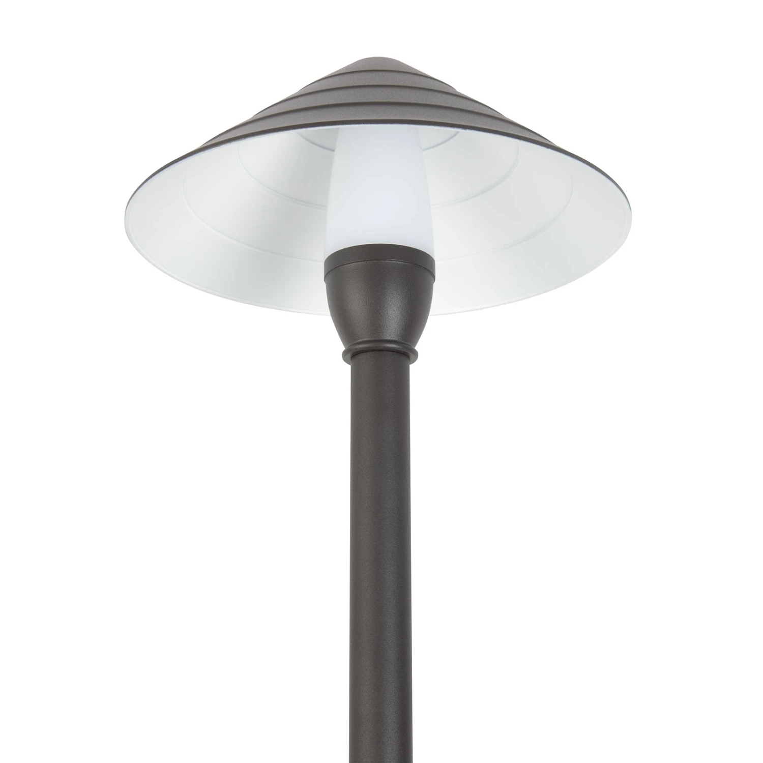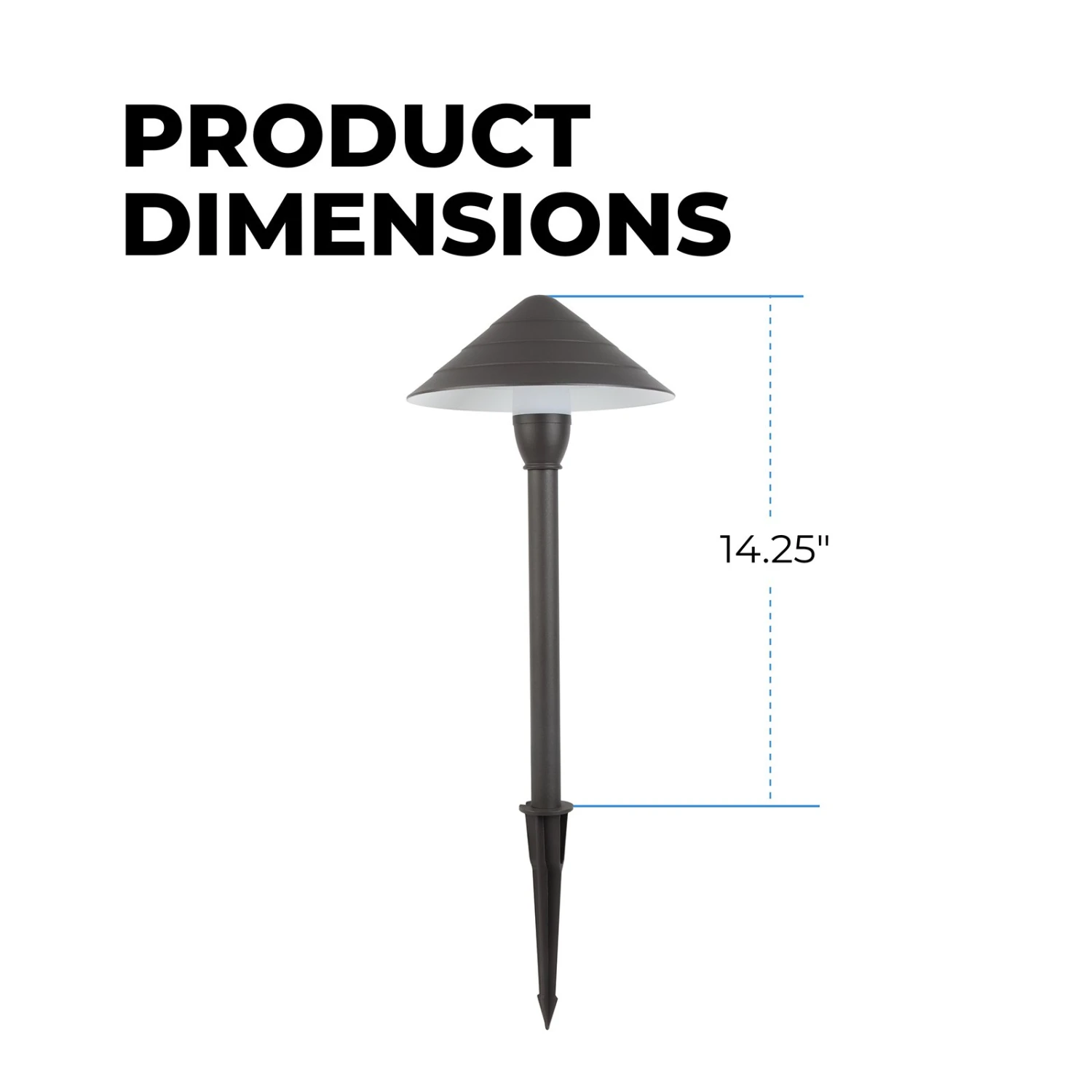 The 12V landscape LED path light features a decorative ring cone shade, a matte bronze finish, and corrosion-resistant construction. The durable cast aluminum fixture has integrated LEDs and a frosted polycarbonate lens for diffused illumination. An IP65 waterproof design protects internal components from the elements. Attach the lens and reflective cone shade to the post and secure the durable aluminum ground stake for installation. The landscape path light is ideal for outdoor walkways, pathways, driveways, and garden lighting.