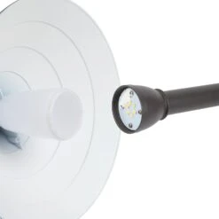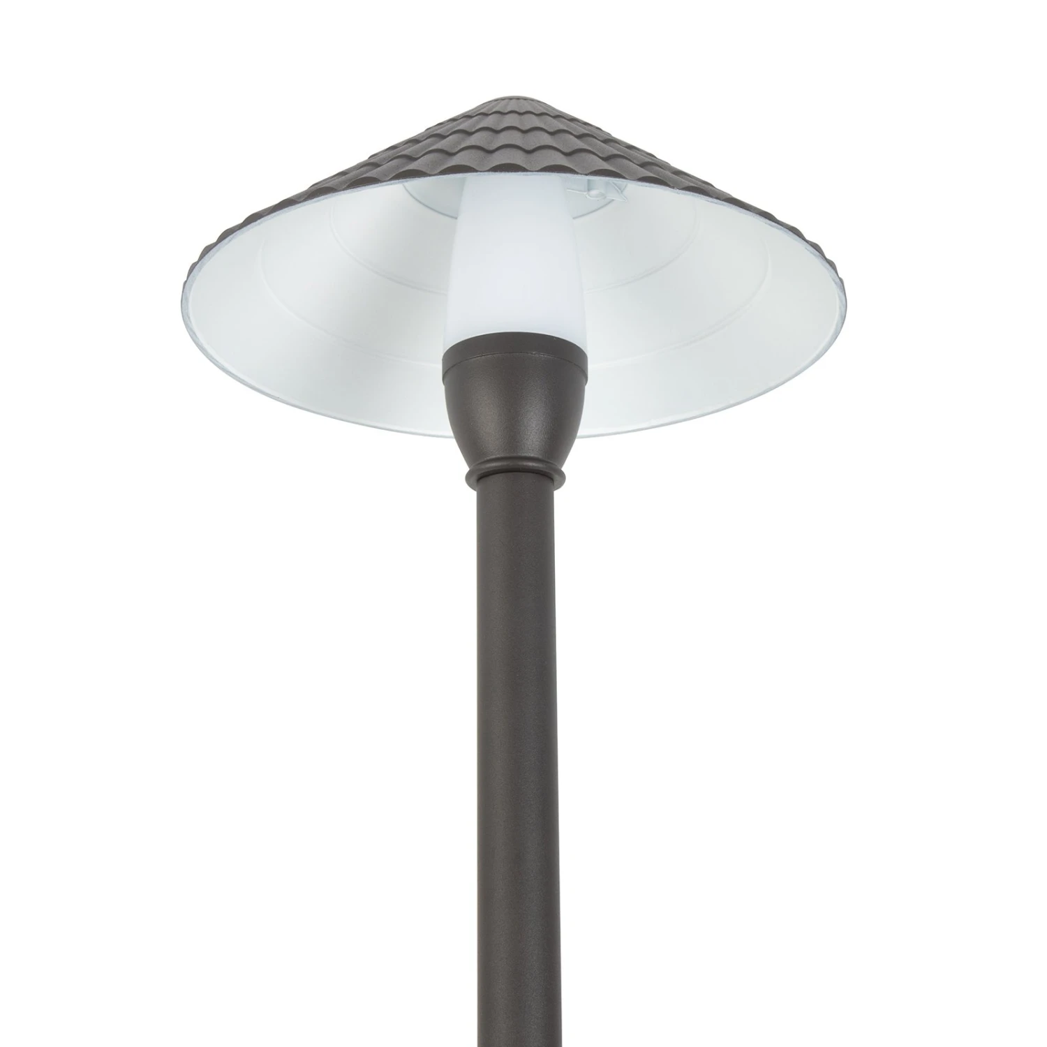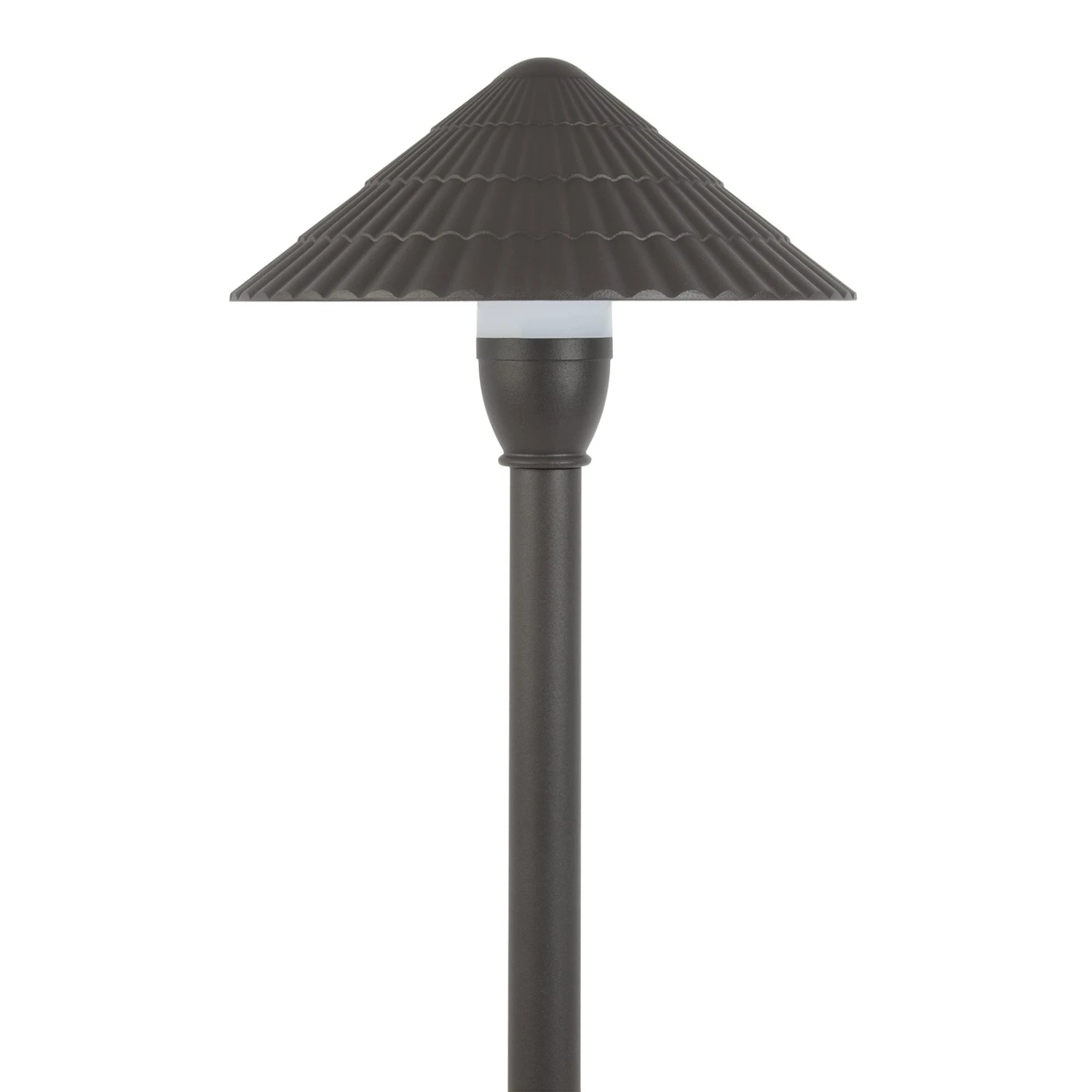 The 12V landscape LED path light features a decorative shingle cone shade, a matte bronze finish, and corrosion-resistant construction. The durable cast aluminum fixture has integrated LEDs and a frosted polycarbonate lens for diffused illumination. An IP65 waterproof design protects internal components from the elements. Attach the lens and reflective cone shade to the post and secure the durable aluminum ground stake for installation. The landscape path light is ideal for outdoor walkways, pathways, driveways, and garden lighting.