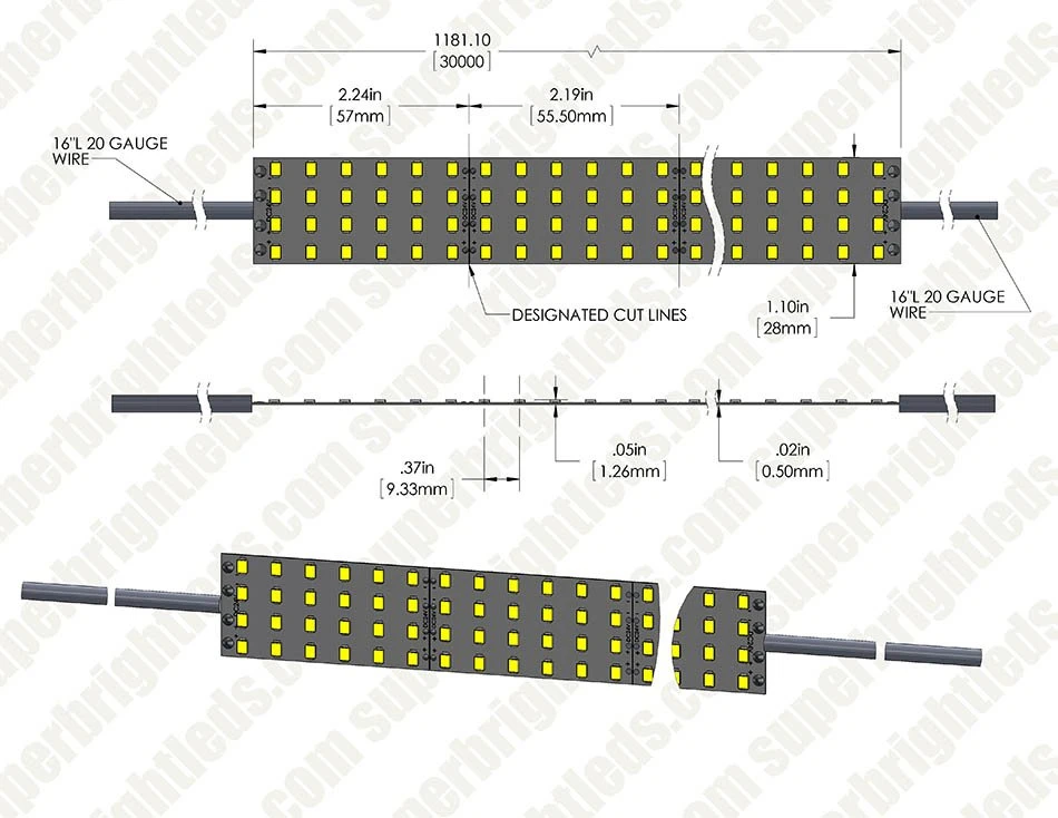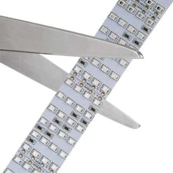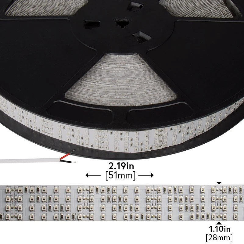 This super-bright LED light strip is great for creating a high-power light fixture and can be used for accent lighting, wall washing, theater lighting, stage lighting, sign backlighting, cabinet lighting, under-cabinet lighting, bias lighting, showcase lighting, trade show lighting, or for other indoor applications where space is limited. Using enhanced 2835 SMD LEDs, the quad-row light strip emits up to 1,085 lumens of blue, red, or green illumination per foot. The non-weatherproof LED strip light can be easily cut into 24-LED segments and installed with its peel-and-stick adhesive backing. The strip must run back to the power source every 16-3/8′ to avoid excessive voltage drop. The single-color light strip has 24 VDC operation and is designed to last 60,000 hours. Price per reel. Also available in custom lengths. High-CRI version also available in cool, natural, and warm white colors. See compatible LED dimmers.
