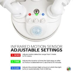 With many adjustable features, the MASL series Motion Sensor Light provides versatile illumination for residential exteriors and perimeter protection. The sensor turns the light on when motion is detected within a wide 120-degree angle, between 3 and 30 feet. Time setting adjusts ON time up to 10 minutes. The Lux setting turns the fixture on when the ambient light reaches the desired level. Or, bypass the sensor during installation for normal on/off flood light operation from a wall switch. Sealed against moisture, dirt, and insects, integrated LEDs withstand outdoor elements while requiring less energy and maintenance than equivalent PAR lamps. Wall or eave mount the lightweight fixture and rotate the three heads for desired light coverage on driveways, yards, patios, and more.
