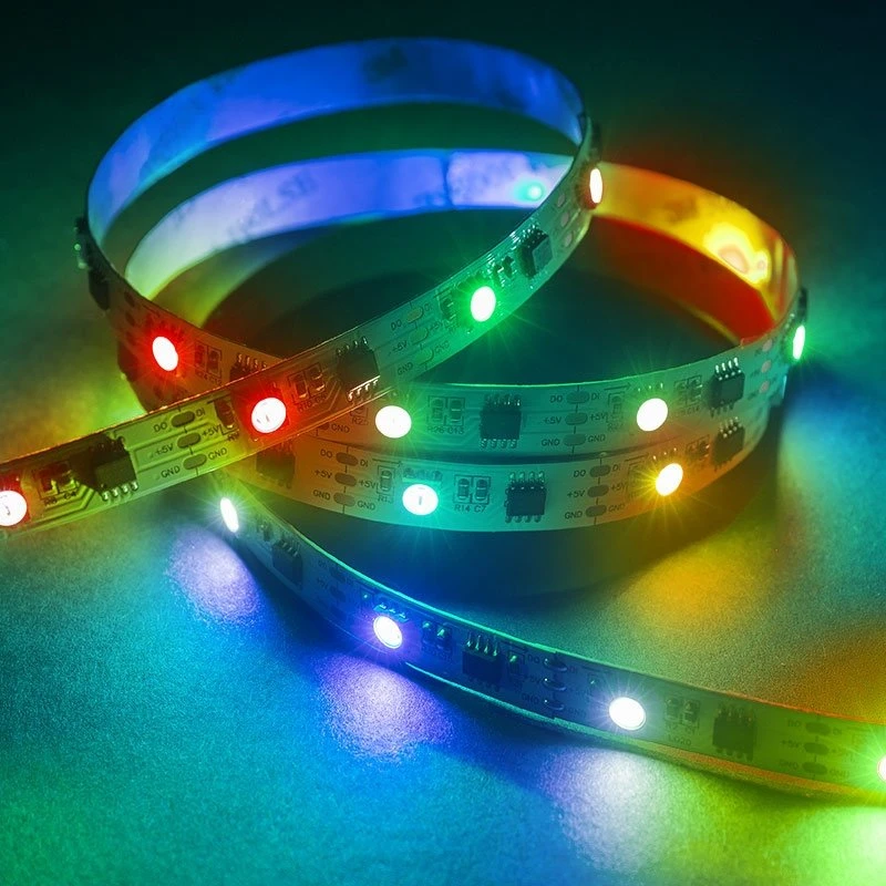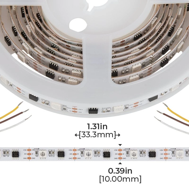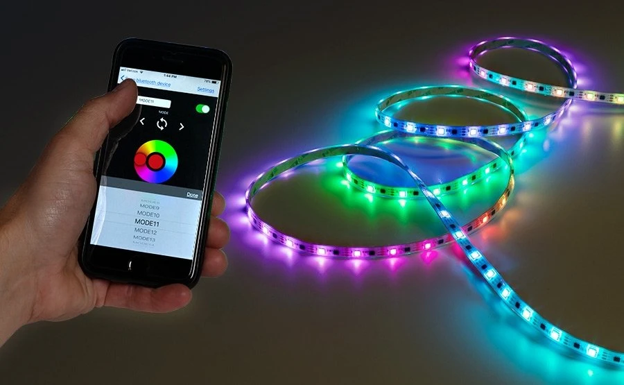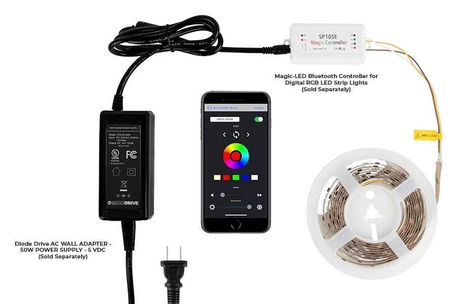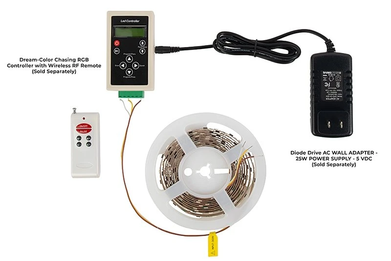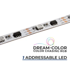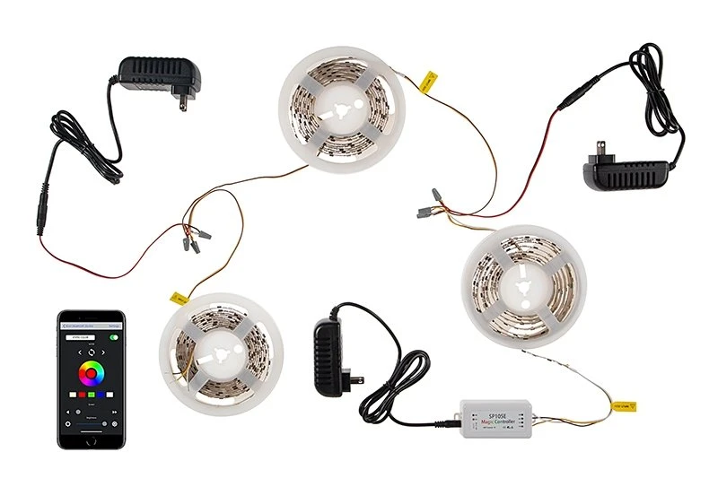 DreamColor series Digital RGB Strip Light has WS2811 IC chip technology to individually address each RGB LED. Use the compatible Magic-LED Bluetooth Controller (sold separately) and Magic-LED app to operate from the convenience of a smartphone. Select from thousands of solid colors and 200 color chasing modes. Customize brightness, sequence length, and chase speed. This tape light requires 5V power, is cuttable every LED, and has 3M™ adhesive backing for quick mounting. Create unique light displays for nightclubs, concert venues, stages and studios, decorative backlighting and more.