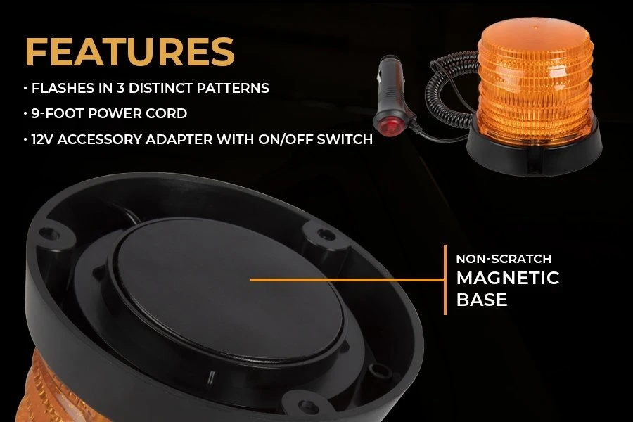 This STB series Strobe Light Beacon provides omni-directional illumination with a triple flash strobe pattern. with a no-scratch magnetic base and 12V car adapter this light beacon has outstanding versatility and easy installation. For more secure mounting use the included screw mount base and mounting hardware. Includes an * 9’ power cord with integrated pattern select switch.