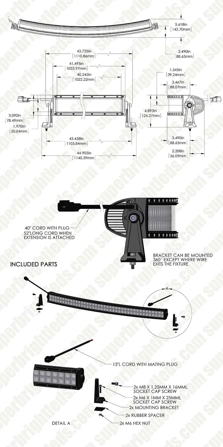This Curved series LED light bar houses 80 powerful LEDs in a distinct curved design. The dual-row of LEDs on the 40” bar emit 19,200 raw lumens of cool white light in a narrow 8° pattern for long-range illumination. Durable and waterproof, this light is built from aluminum with a polycarbonate lens. Adjustable mounting feet and installation hardware are included along with the 40” wire lead and mating 13” DT pigtail adapter.