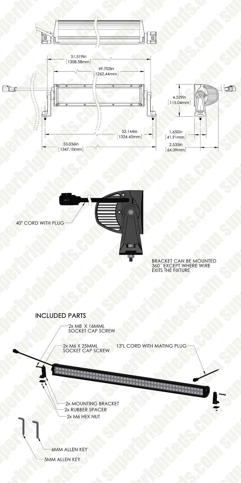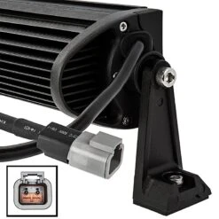 The Super series LED light bar provides illumination for off-road driving and industrial lighting with 2 rows of LEDs on the long 50” bar. The 96 LEDs provide 18,000 lumens of cool white illumination from either a 90° flood beam or a combo 30° spot / 90° flood beam pattern. The polycarbonate lens and aluminum housing are waterproof and shock resistant. An integral heat sink allows the LEDs to run cool, leading to long life spans. Includes mounting feet and installation hardware.