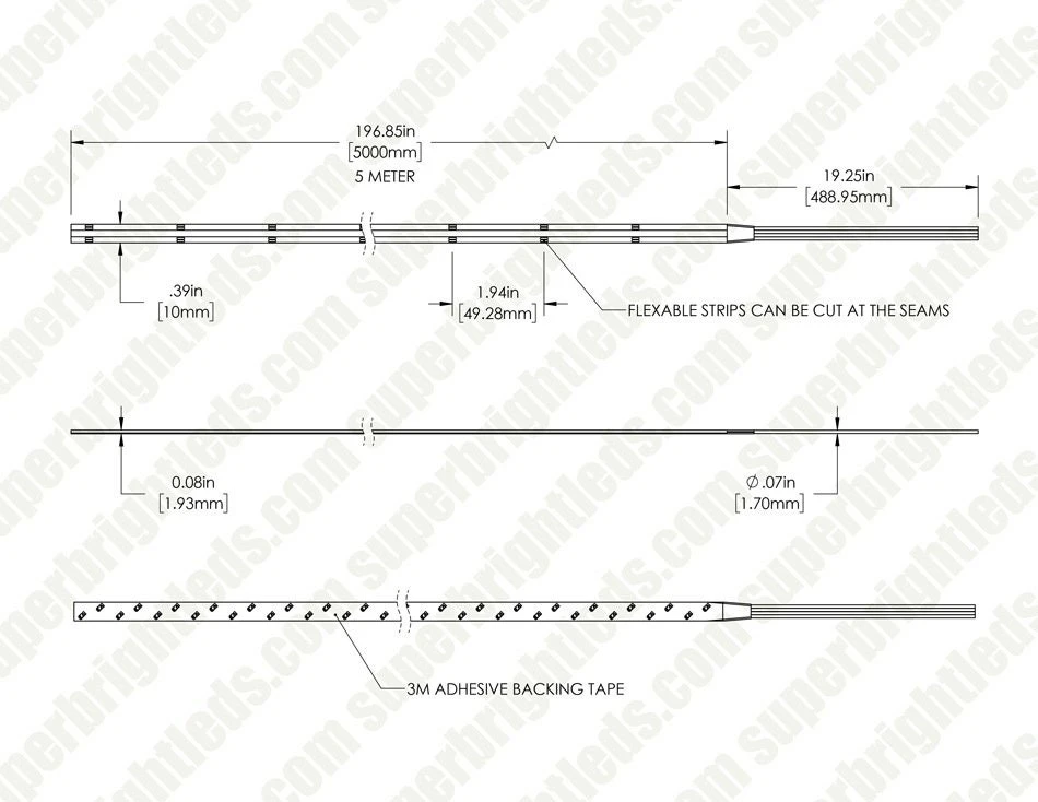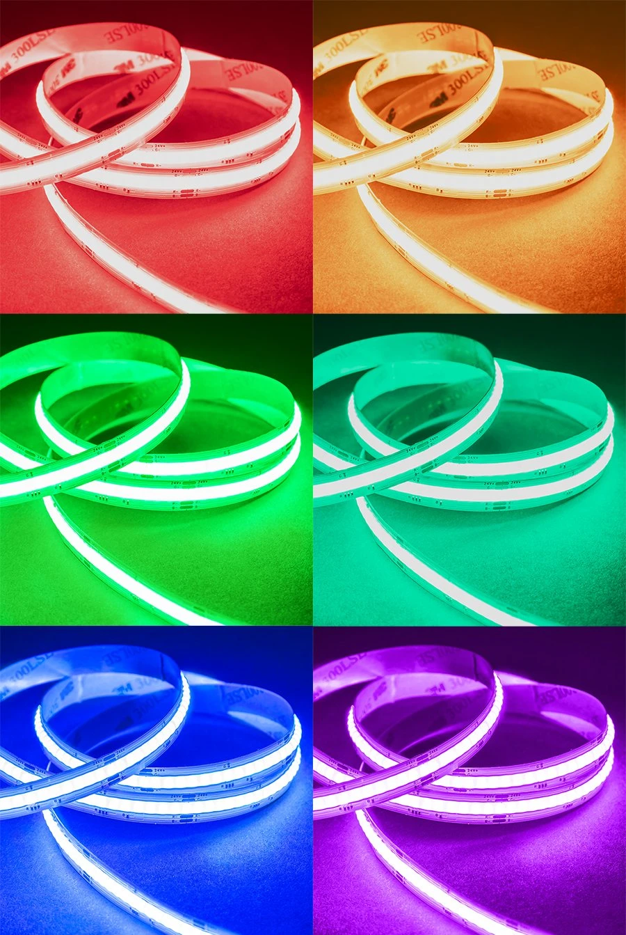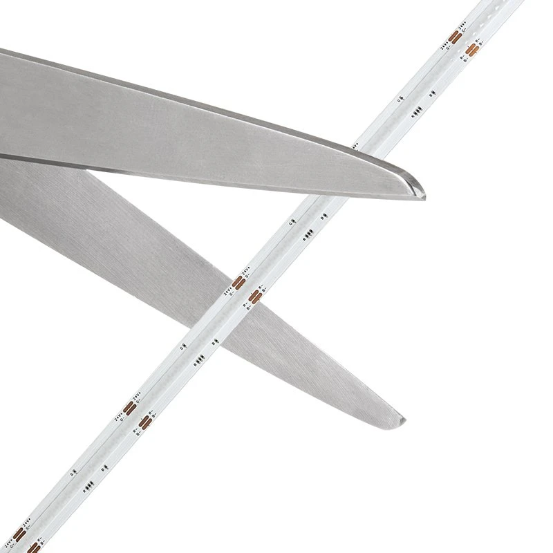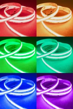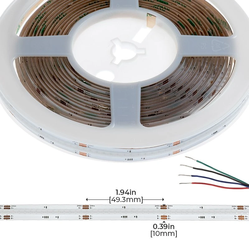 The 5m RGB COB LED Strip Light uses chip-on-board technology to create a smooth, seamless line of light. Using a high density of LEDs, the COB strip light produces a continuous linear light without hotspots, ideal for applications on or around reflective surfaces such as granite countertops and tile floors. The strip provides a range of vibrant RGB lighting to any indoor application. Easily customize the strip using the cut segments every 1.97 inches. Flexible construction and 3M™ adhesive backing make it easy to install, including on round surfaces and edges. Pair with a controller (sold separately) to customize color tone and settings.