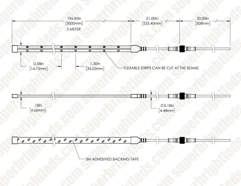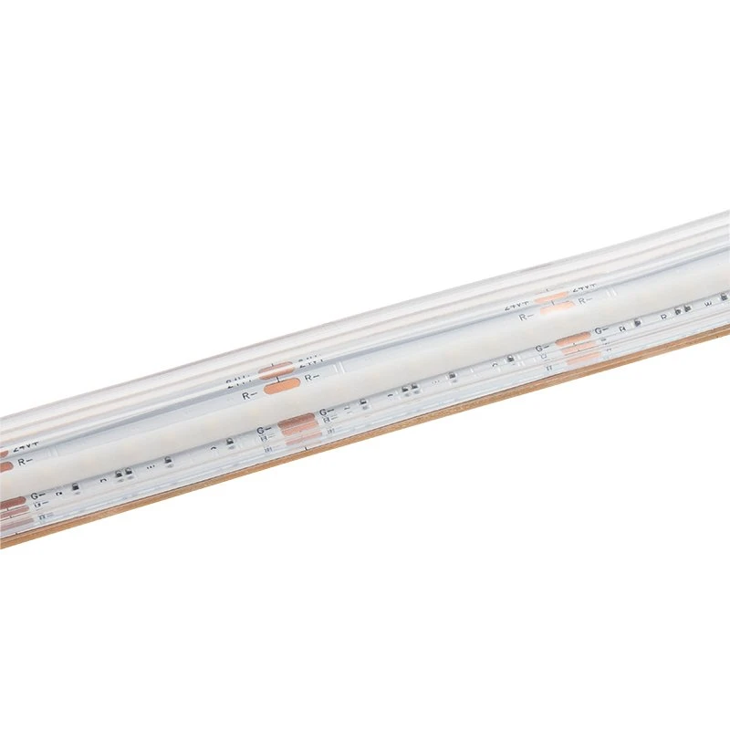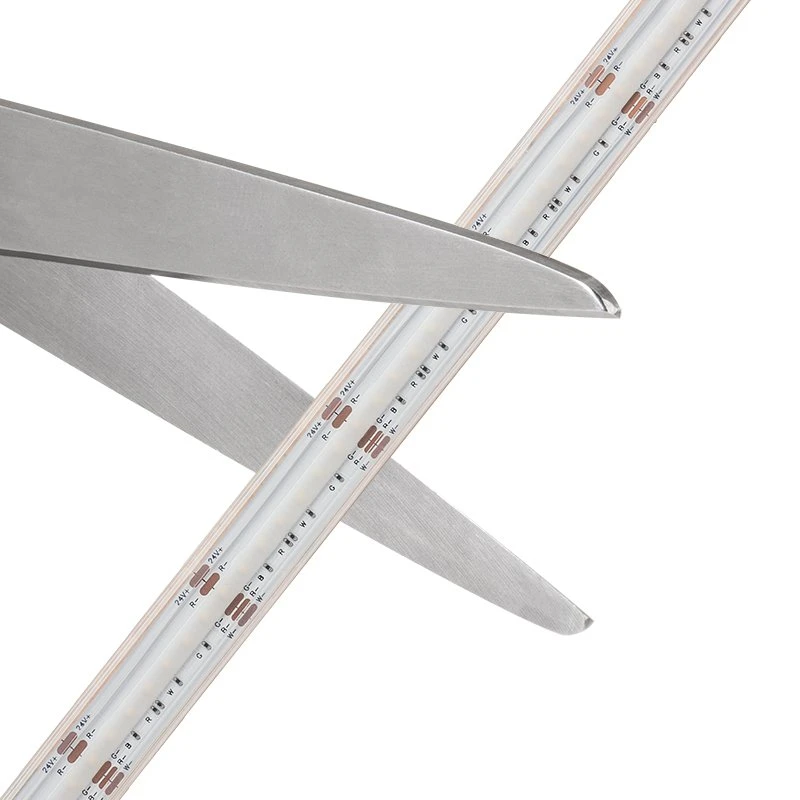 The 5m RGB+White COB LED Strip Light uses chip-on-board technology to create a smooth, seamless line of light. Using a high density of LEDs, the COB strip light produces a continuous linear light without hotspots, ideal for applications on or around reflective surfaces such as granite countertops and tile floors. The strip provides a range of vibrant RGB lighting and your choice of warm white, natural white, or cool white. The waterproof IP65 rating allows the strip the be installed in wet locations such as patios and decks. Easily customize the strip using the cut segments every 1.31 inches. Flexible construction and 3M™ adhesive backing make it easy to install, including on round surfaces and edges. Pair with a controller (sold separately) to customize color tone and settings.