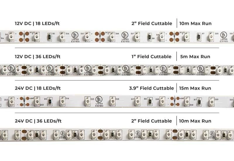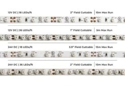 - Run 12V strips up to 5m; run 24V strips up to 12.5m