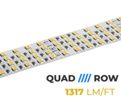 This super-bright LED light strip is great for creating a high-power light fixture. It operates on 24 VDC and can be used in longer runs than 12V strips. The powerful LED tape light emits 1,317 lumens of cool, natural, or warm white illumination per foot. And with a high CRI (color-rendering index) of up to 94, light from the LEDs will show the true colors of any object or surrounding. The 16.4′ quad-row LED tape light can be easily cut into separate 24-LED segments and installed with its peel-and-stick 3M™ adhesive backing. This strip is designed to last 60,000 hours. It’s great for retail shops, supermarkets, food and meat cases, museums, galleries, videography, and other indoor applications where presentation, appearance, and depth of color are critical. Also available in custom lengths.