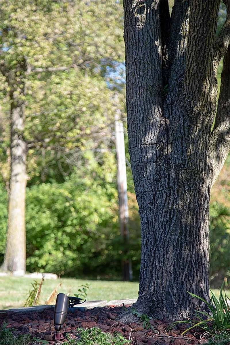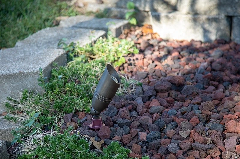 Complete your outdoor design with this six-piece bronze LED spot light kit. With a 180° rotation angle, fixtures consist of brass housing with glass lenses. In addition to the fixtures, the kit includes single-color MR16 bulbs in 6500K, 4000K, 3000K, or 2700K color temperature. A 60W, low-voltage transformer operates on either constant-on, automated dusk-to-dawn, or timed-off after 1-9 hours settings. 8 1/2″ ground stakes are included. Ideal for gardens, tree uplighting, subdivision signs, and architectural lighting.
