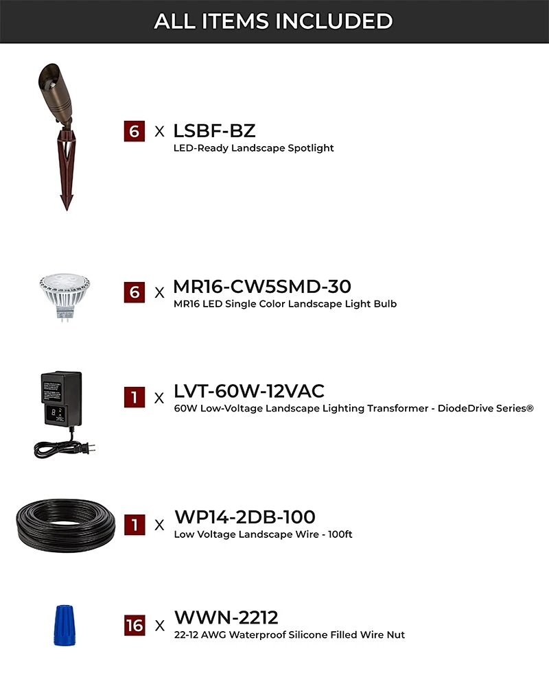 Be the first to review “6-piece LED Spot Light Landscape Lighting Kit – MR16 Bulbs – 60W Low Voltage Transformer – 2700K / 3000K / 4000K / 6500K” Cancel reply