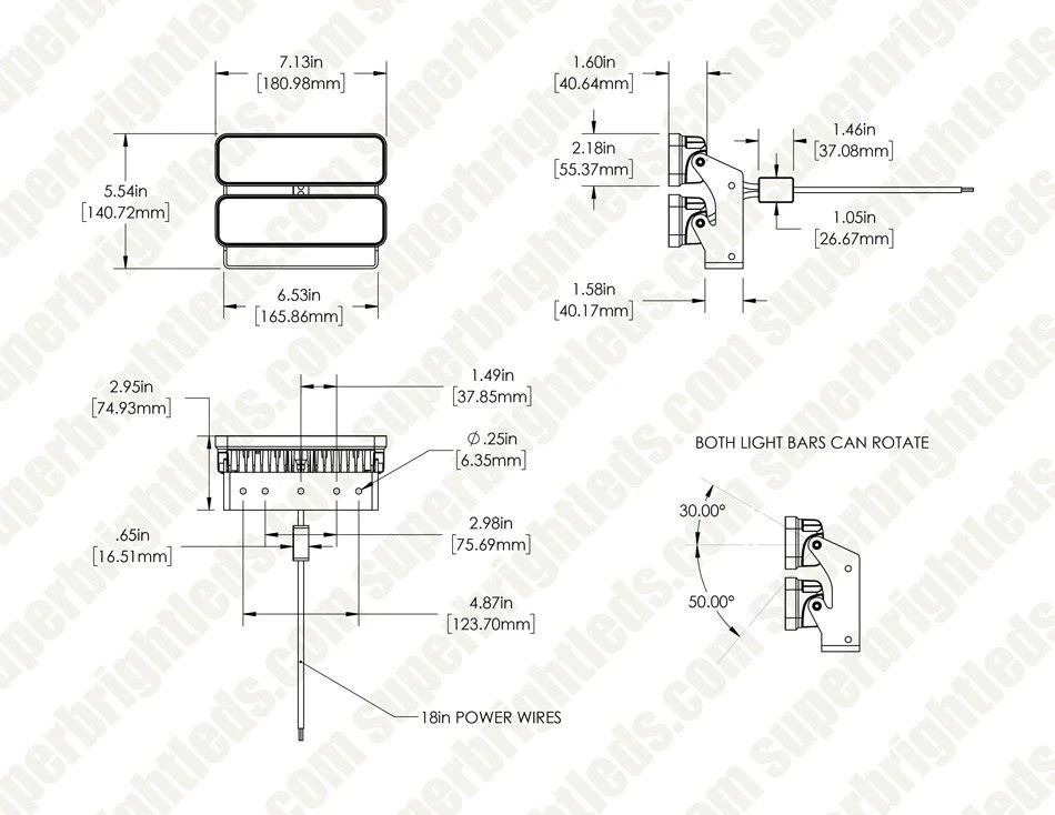The unique design of VWL series Dual Head LED Work Light gives greater control and flexibility for vehicle lighting. Customize the beam pattern for the changing demands of off-road and heavy-duty work environments, switching between short and long range illumination. Select the top light bar to create a 15° spot beam for a more narrow, long-range illumination. Turn on only the bottom for a 45° flood beam with wider coverage. Or, operate both at the same time for a combo beam. Each off-road light bar can be individually angled for further optimization. Built for durability, the aluminum housing and polycarbonate lens are water and impact resistant.