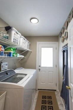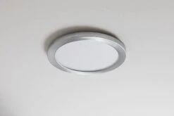 This slim 7″ LED downlight with satin nickel trim emits 960 lumens of dimmable warm white light. It uses Even-Glow® technology, which consists of a light-guide plate and an optical diffuser, to deliver smooth illumination without visible bulbs or hot spots. Install the flush-mount ceiling light directly on a round or octagonal junction box with the light’s included bracket or in any existing 4″ or 5″-6″ can light housing with optional can light conversion kit hardware. An E26/E27 Edison screw base adapter is included with the conversion kits. The 12-watt LED panel light is comparable to 75-watt incandescent bulbs but is designed to last 67 times longer. This LED light is perfect for living rooms, basements, offices, and kitchens.