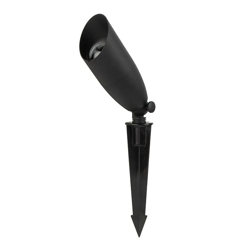 The cast aluminum LED-ready landscape spot light is available with a GU5.3 base MR16 LED bulb in 2700K, 3000K, 4000K, or 6500K, delivering 400 lumens in a 30-degree beam. The cast aluminum housing, fixed glare shield, and glass lens have an o-ring sealed weatherproof construction. The 180-degree adjustable knuckle mount lets you aim the beam for focused lighting. The landscape spot light is ideal for tree uplighting, subdivision signs, and architectural lighting.