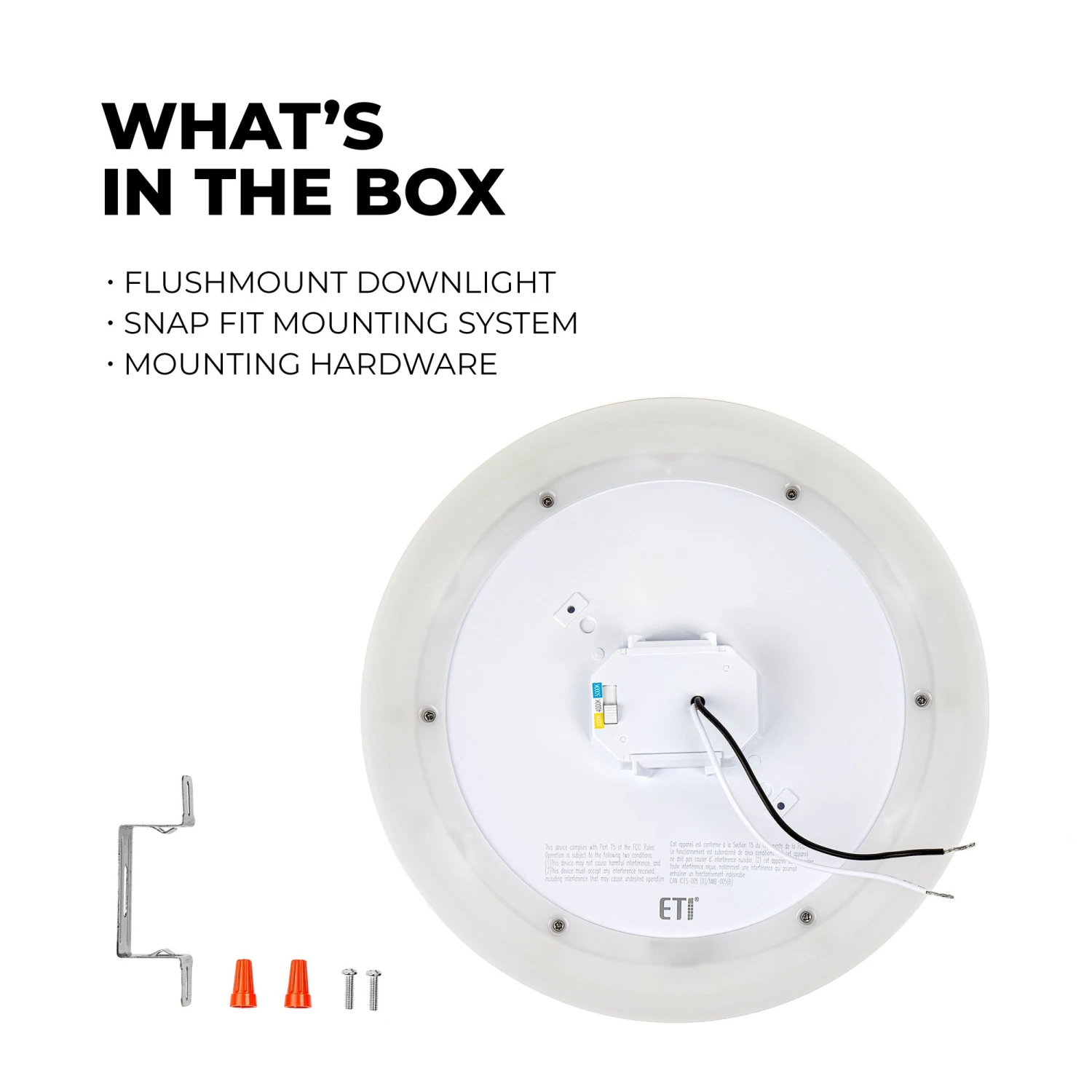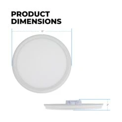 The ETi 11-inch SnapFit LowPro Color Preference® downlight with nightlight trim is a low-profile flush mount downlight with the innovative SnapFit mounting system and a decorative molded trim. The energy-efficient fixture delivers 900 lumens, replacing a traditional 75-watt incandescent, while consuming only 14 watts. The downlight has three color temperatures, 3000K, 4000K, and 5000K, selectable via a switch on the back of the fixture. The SnapFit design allows you to install the bracket in a standard junction box, wire the fixture, and snap it in place for easy installation. Use the wall switch to change from the primary light to the 2000K NightlightR trim light, which delivers an ultra-warm ambient light on the ceiling around the fixture. The TRIAC dimmable fixture is IC rated for direct contact with insulation.