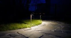These decorative LED path lights add an upscale look to any outdoor space and are designed for use as garden lights, patio lights, driveway lights, landscape lights, walkway lights, or sidewalk lights. The 20″ bronze or black LED lights are constructed of rust-resistant powder coated aluminum and have offset cone-shaped shades. They emit 170 lumens of warm white illumination directly over anything that you need to highlight. An 8.5″ ground stake is included and easily screws onto the path light’s down rod. The 18-gauge wire measures 48″ from its exit point on the stake. By adding the recommended Male Pigtail Power Cable, the light becomes compatible with G-LUX accessories. Price per fixture.