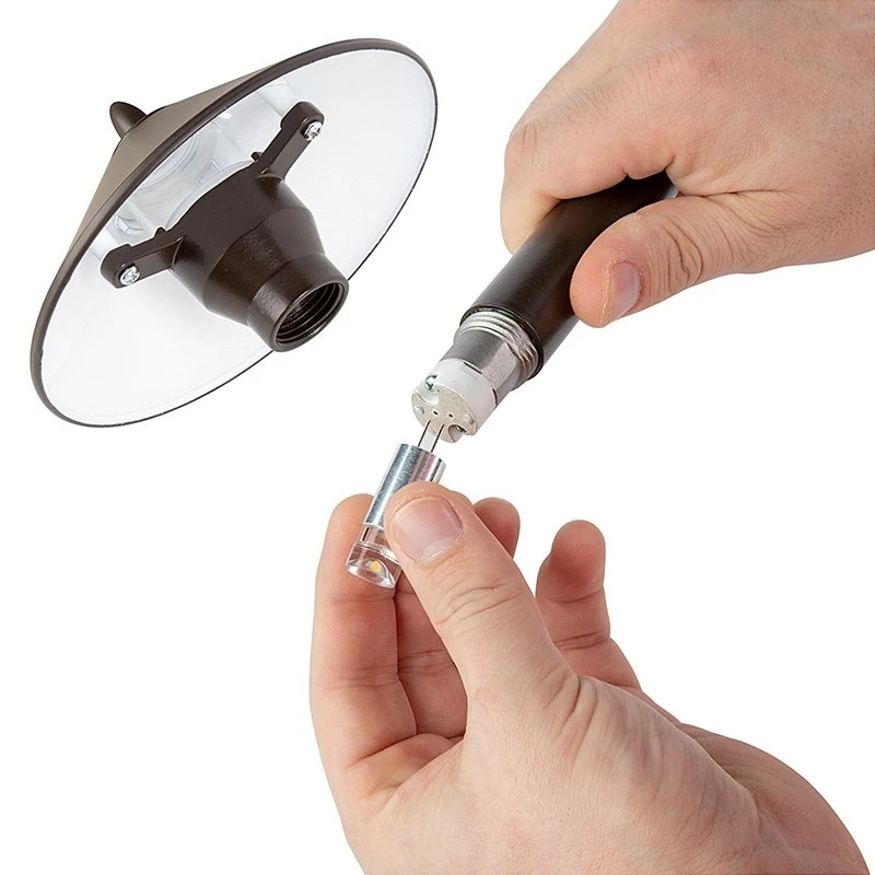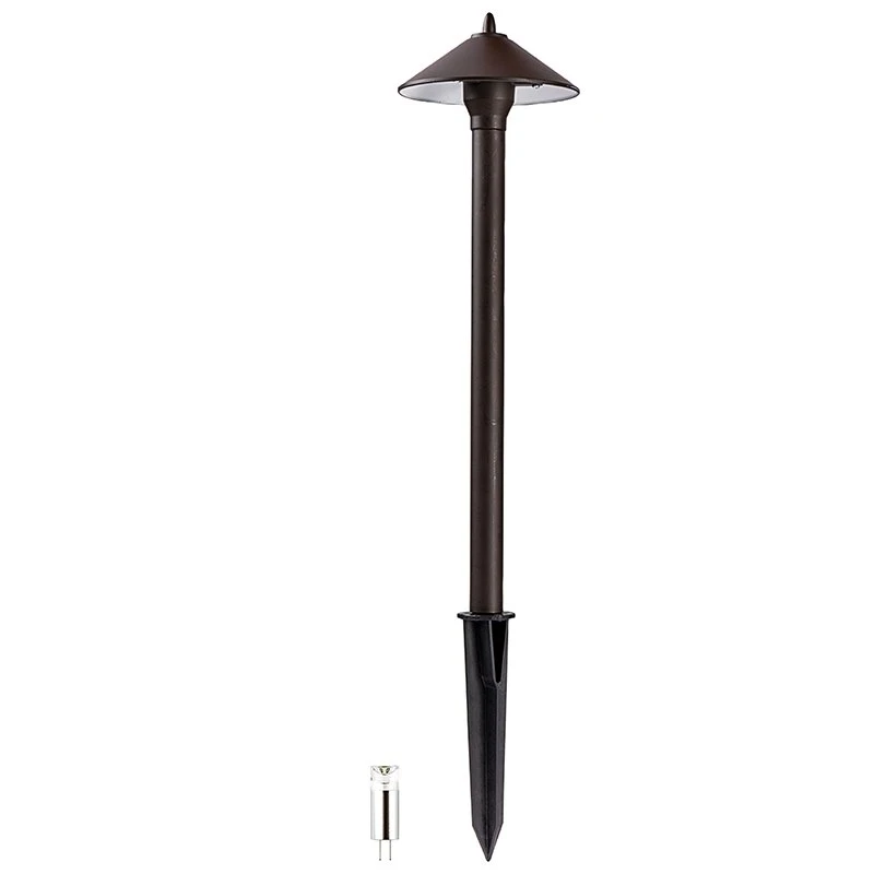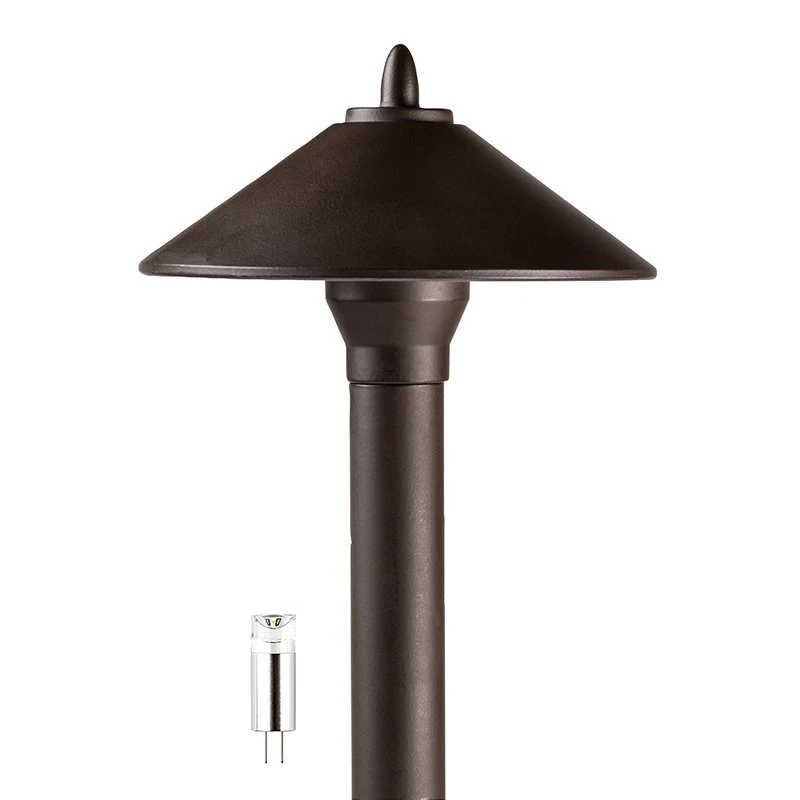 The landscape LED-ready cone shade path light is a decorative drop-in fixture that adds an upscale look to any outdoor space. The light is ideal for use as patio lights, landscape lights, and walkway lights. The 16″ bronze LED ready path light is constructed of corrosion-resistant powder-coated aluminum and has a cone-shaped shade for wide light distribution. Bundles include a plug-and-play G4 bulb with 105 lumens. Options include warm, natural, or cool white. A 6″ ground stake is included and easily screws onto the path light for mounting.