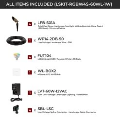 This LED landscape lighting kit features four spotlights, adjustable RGB+Tunable White MR16 bulbs, a low-voltage transformer, and installation accessories. The included spotlights are constructed of corrosion-resistant solid brass, a rounded glass lens, and water-tight silicone o-rings to prevent water intrusion. Precisely aim the light using the knuckle or the adjustable glare guard. The MR16 bulb is equipped with RGB+tunable white functionality, select between a range of RGB colors and tunable whites for customizable outdoor lighting. Using an optional RF remote, select the bulb color and adjust the speed, brightness, and saturation. Using an optional MiBoxer Wi-Fi LED controller hub, control the bulb’s color and adjust the speed, brightness, and saturation from your smartphone or tablet with the Tuya Smart App The 60W low-voltage transformer has digital control for easy navigation and three operational modes: constant on, automatic dusk to dawn, and timed OFF 1-9 hours after dusk. 50ft wire and four splice connectors complete the set, for a total landscape illumination package.