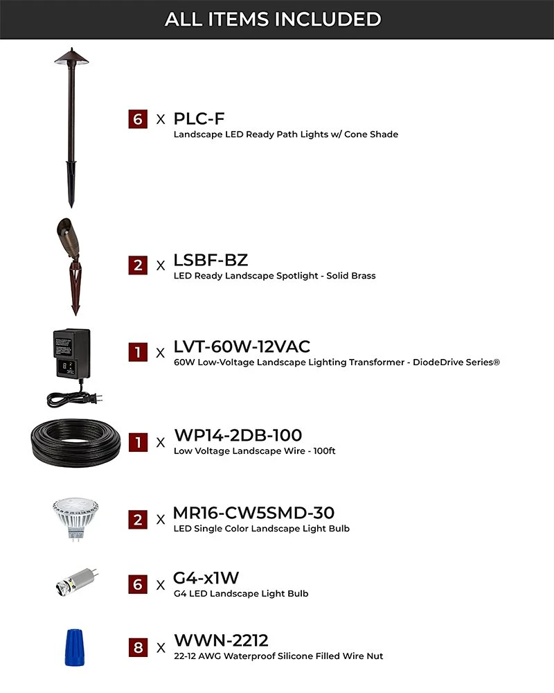 Be the first to review “LED Landscape Lighting Kit – 6 Cone Shade Path Lights – 2 Spotlights – Low Voltage Transformer” Cancel reply
