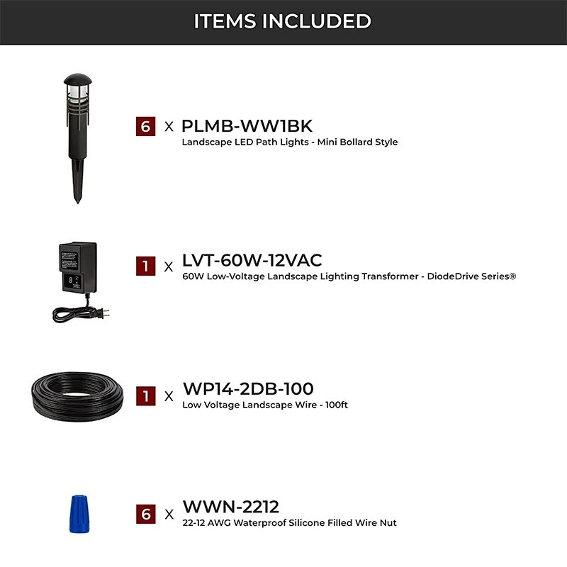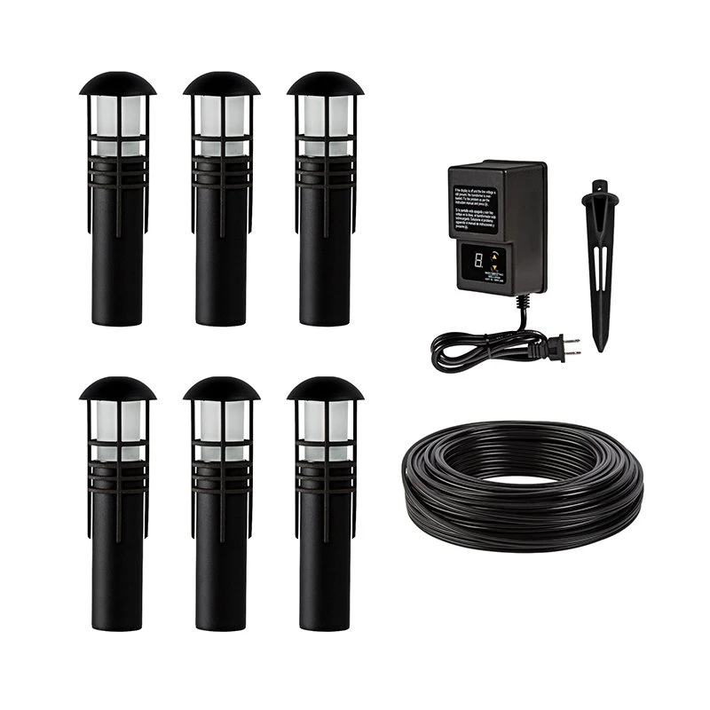 Line these 6 LED Mini Bollard Lights along walkways, garden paths, or sidewalks with this complete landscape lighting kit. Black aluminum path light is 10″ in length, with 6.5″ mounting stake, and LEDs are integrated into fixture for secure 360 degree illumination. Low voltage transformer has digital controls to select between three modes: constant ON, dusk to dawn, and timed OFF 1-9 hours after dusk. Wire and wiring accessories are weatherproof for a sealed, simple installation process.