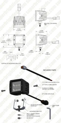 The CL3 Series boasts a classic pod light design with durable construction for a wide range of applications. It is available with a 90° flood beam pattern for area lighting, this 3” Square LED Work Light pod is ideal for off-road vehicles, boats, and tractors. The work light produces 1,400 raw lumens of cool white light from the six powerful LEDs. The aluminum housing is built with an integral heat sink that protects the internal components. Includes an adjustable stainless steel mounting bracket.