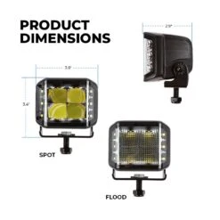 Our HS3 Series features 3″ side shooter lights with an ultra-modern design. The 70W LED side shooter light pods deliver 8,400 lumens with a 20° spot beam pattern that improves long-range lighting or a 110° flood beam pattern that improves near-range visibility. The side shooters increase the total beam angle to 140°. The enhanced thermal management adjusts light output at temperature extremes to lengthen lifetime while providing the maximum illumination possible. A die-cast aluminum housing and polycarbonate lens provide dust, water, and impact resistance. Mount the light pods to a variety of off-road vehicles using the included stainless steel mounting hardware.