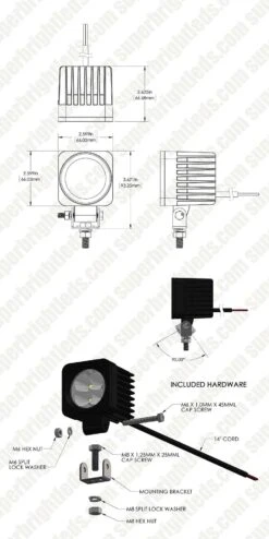 The UTE Series LED Pod Lights feature heavy-duty construction with a classic lens design for uniform light distribution. With its compact design, the 2.5″ Square LED Work Light fits a wide variety of applications, from off-road vehicles, to utility and emergency vehicles, and many more. The 6 LEDs produce 1,050 raw lumens in a 60° flood beam pattern. Aluminum housing and integral heat sink keep the internal components safe from debris and heat. Includes a stainless steel adjustable stud mounting bracket included.