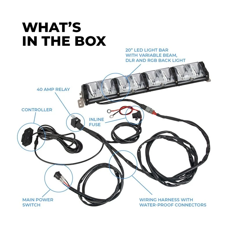 20″ LED Off-Road Light Bar features RGB Backlighting, 6 adjustable beam patterns, and dedicated 30° driving beam. Adjustable beam patterns range from 10° spot to 60° flood, as well as a 30° driving beam—ideal for slow, moderate, and high off-road speeds. RGB backlight includes 7 color options (Red, Green, Blue, Yellow, Purple, Cyan, and RGB White). Complete package also includes stainless steel brackets and hardware, and a wiring harness with relay, in-line fuse, main power rocker switch, and hardwired controller backed with double-sided tape. Rugged aluminum housing and polycarbonate lens mean this light bar is built to last, backed by a Lifetime Warranty.