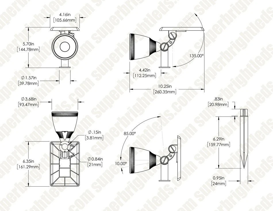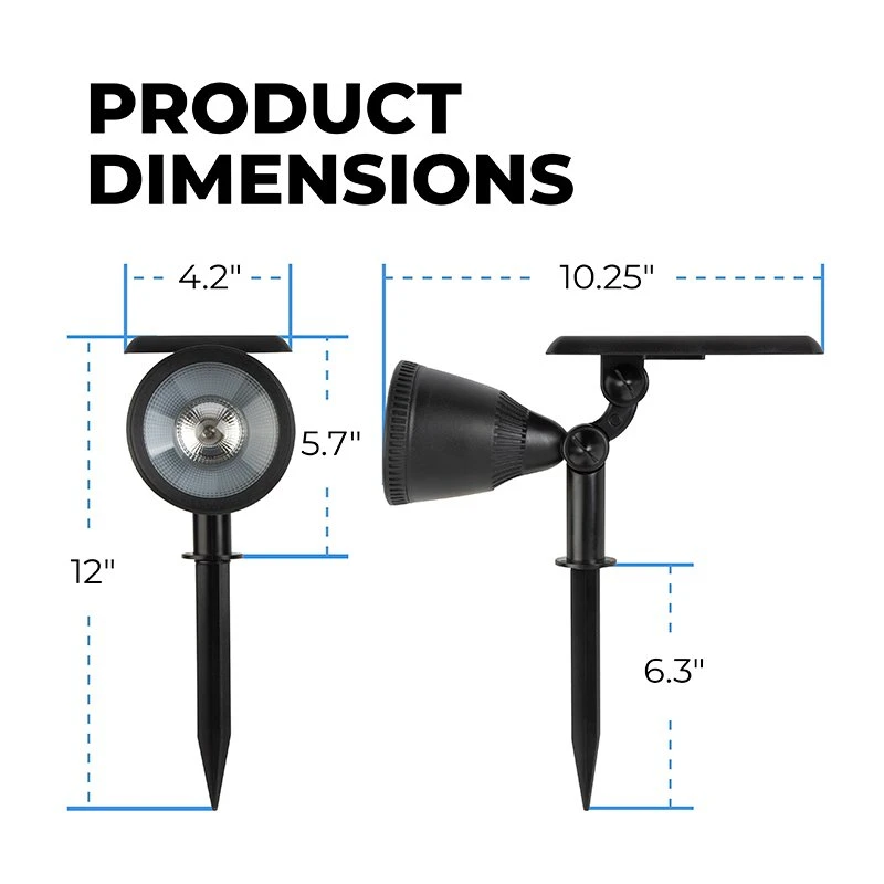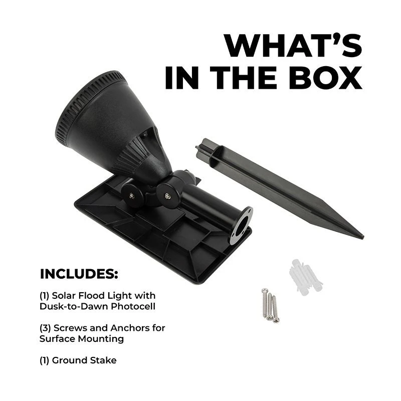 The RGB LED solar flood light with a dusk-to-dawn photocell is ideal for outdoor accent lighting with multiple lighting modes. Once fully charged, 5 to 6 hours, the 120-degree flood light is ready for use with a 6- to 12-hour run time. Use the switch to choose between static red, blue, green, RGB white, automatic RGB color cycling, or off. The light modes have an automatic dusk-to-dawn operation. The light head and solar panel are independently adjustable, 135 degrees for the solar panel. Mount the flood light with the included ground stake or surface mount with included stainless steel screws. This eco-friendly solar flood light is IP65-rated waterproof for outdoor use.