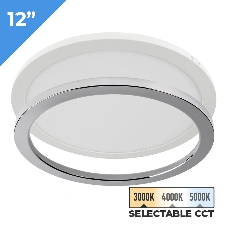 TCP’s 12″ LED Slim Flush Mount Fixtures are perfect for new construction or retrofit projects. They are color selectable and come with a satin nickel magnetic trim ring. The field-selectable CCT allows you to select the color temperature that suits your needs. The frosted lens diffuses the 120° beam angle, producing a uniform light distribution. Install directly to a junction box or within a 5″ or 6″ recessed can. IC Rated for contact with insulation.